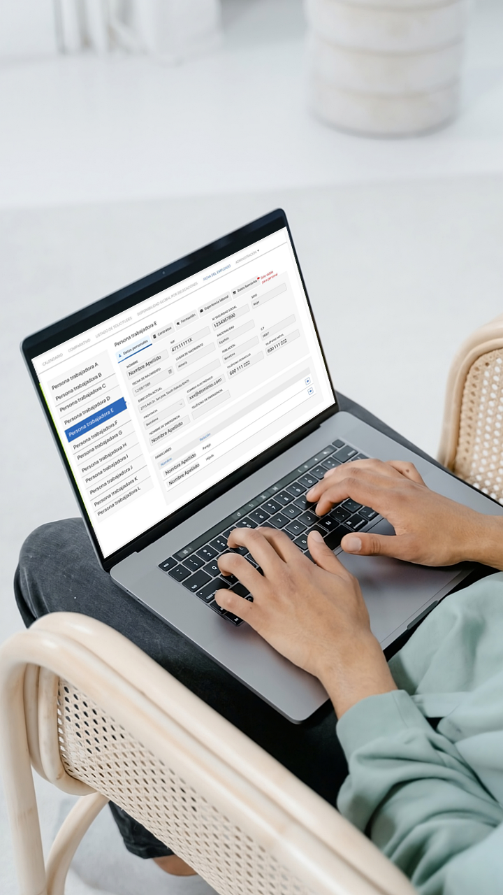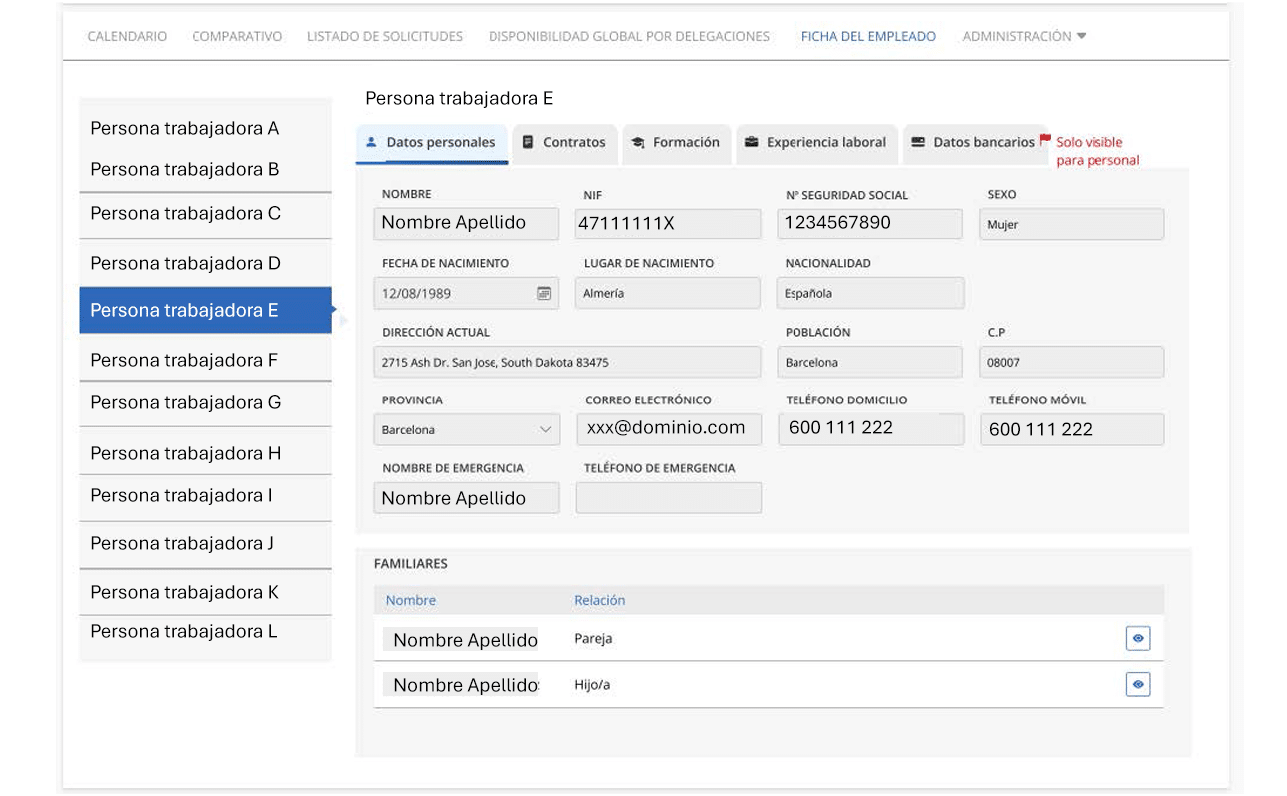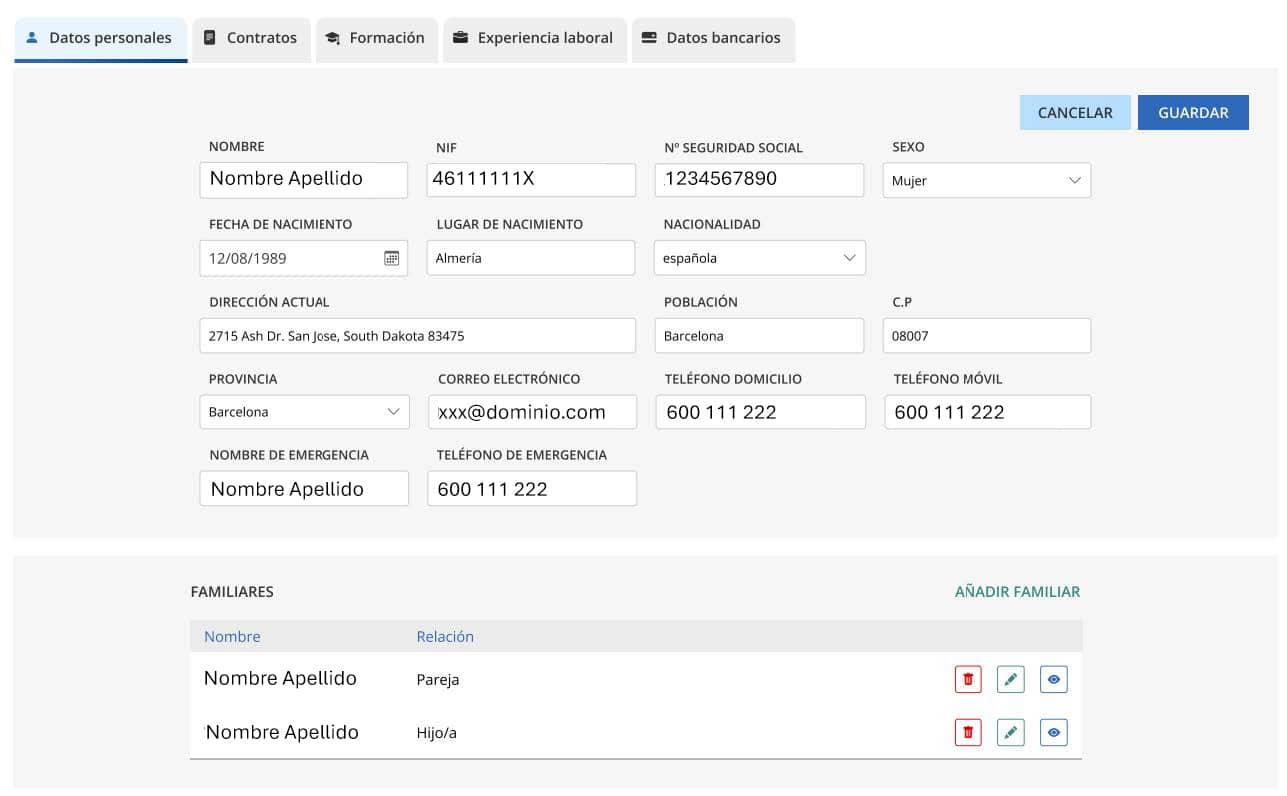 • Formulario a medida que reúne toda la información de la persona trabajadora: datos personales, contrato, formación, experiencia laboral, datos bancarios (solo visible para el «Rol Personal»).