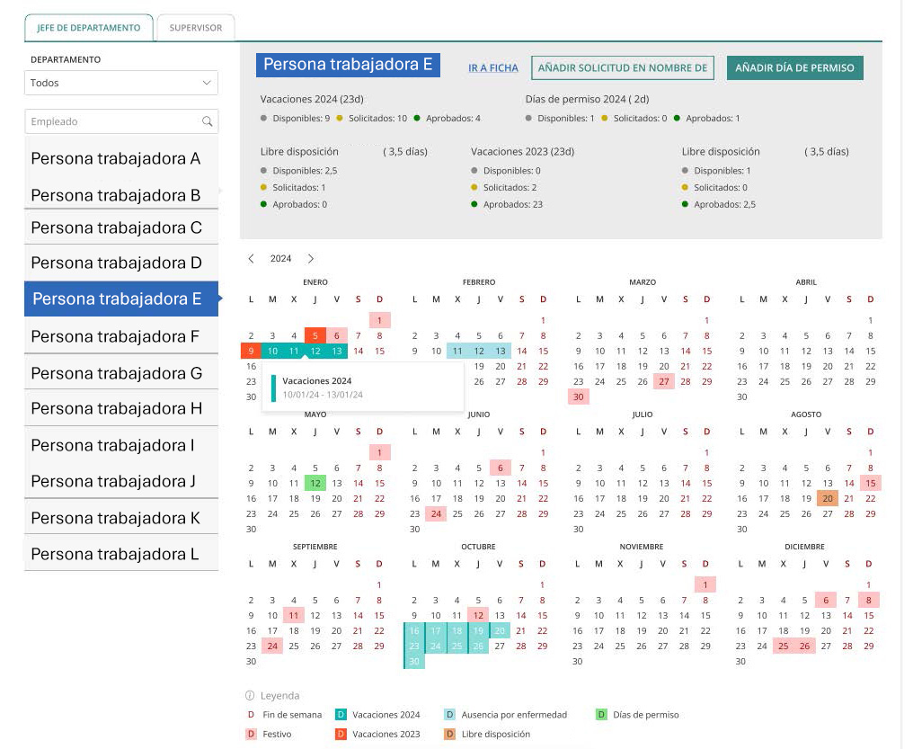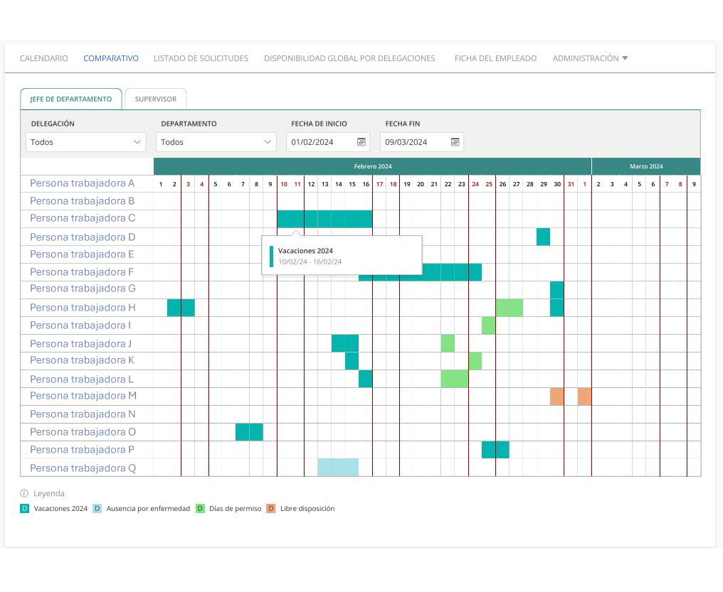 • Vista completa de los permisos y ausencias de todo el personal supervisado.