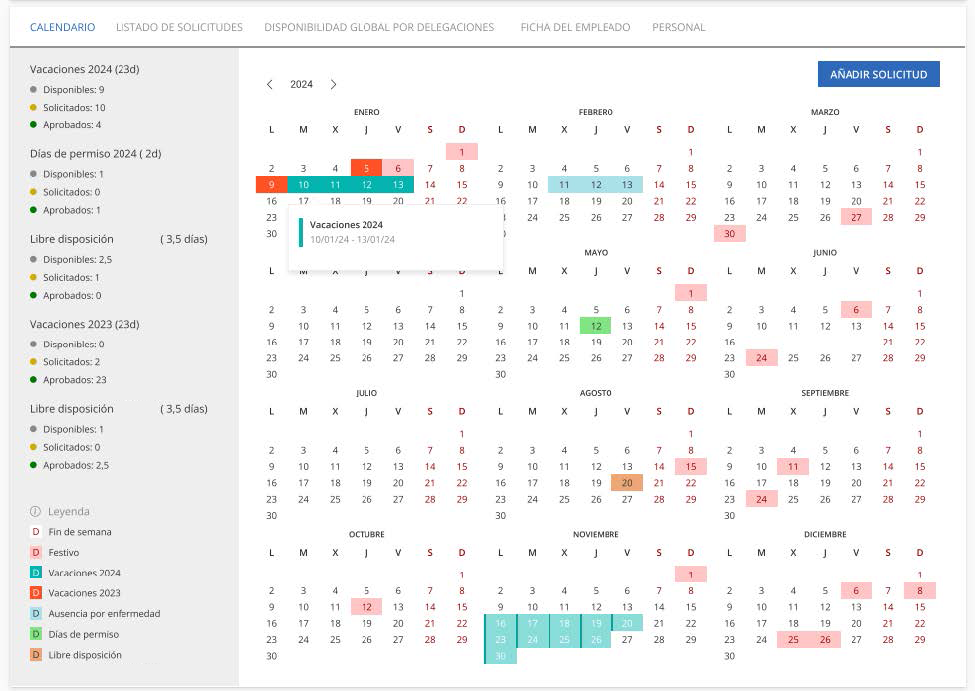 • Gestión de vacaciones: Gestión de permisos y ausencias.